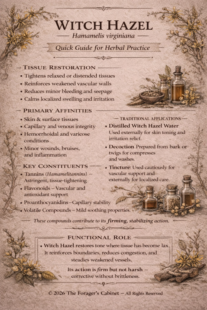 This timing reflects its medicinal role. Witch hazel supports tissues that have become lax, swollen, or irritated—particularly those involving surface structures, capillary integrity, and localized inflammation.